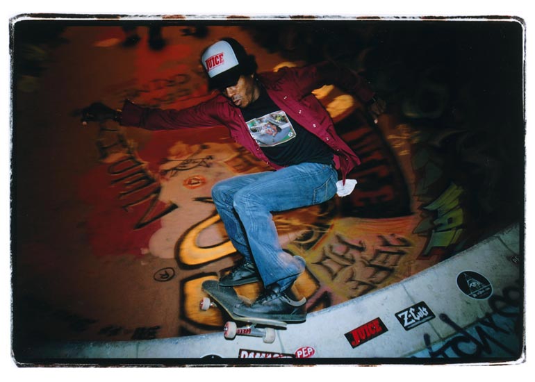 Los Angeles based urban artist, Steve Martinez, is best known for capturing the frenetic West Coast lifestyles through the lens of a camera or the bristles of a brush. Seizing the raw energy of everything from skateboarding to punk music to the hard core lowrider scene, Steve brings these fringe elements to life like no one else. When he's not artistically enhancing the city of angels he can be found working behind the scenes of Playboy Magazine.